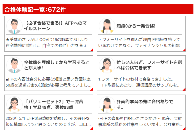 フォーサイトFP講座は非常に多くの2級FP技能検定一発合格者を輩出している通信講座です。事実、公開されている合格体験記を「試験種別:FP2級」かつ「受験回数:初回」で絞り込むと、672件もの一発合格体験記を読むことができます。