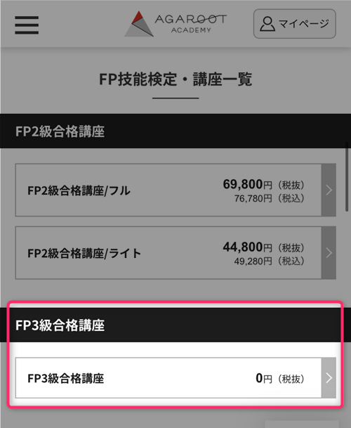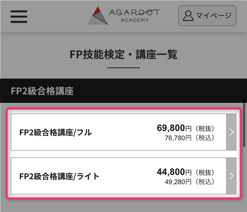 鋭い方は「代わりに受講料がお高いんでしょ?」と思われたのではないでしょうか。確かにアガルートの受講料は他の通信講座よりもやや高いことが多いです。しかしながら、FP通信講座に関してはそうでもありません。
