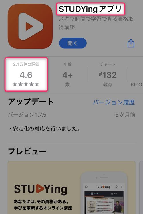 でも、スタディングのアプリは抜群に使いやすいのが特徴。講義動画・テキスト・問題演習をシームレスに行き来でき、ストレスを一切感じさせません。実際、アプリストアの評価も非常に良いです。