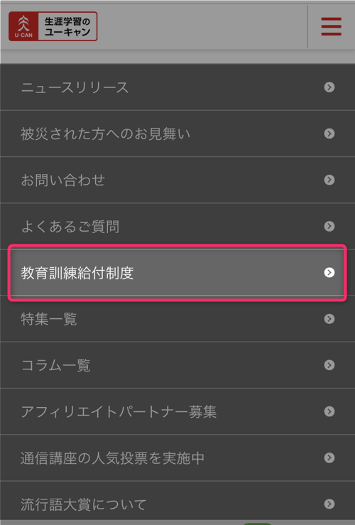 ユーキャンFP講座の教育訓練給付制度の利用詳細については、ユーキャン トップページのメニュー(スマホの場合は最下部、PCの場合は左サイドバー)より次の箇所をご覧ください。